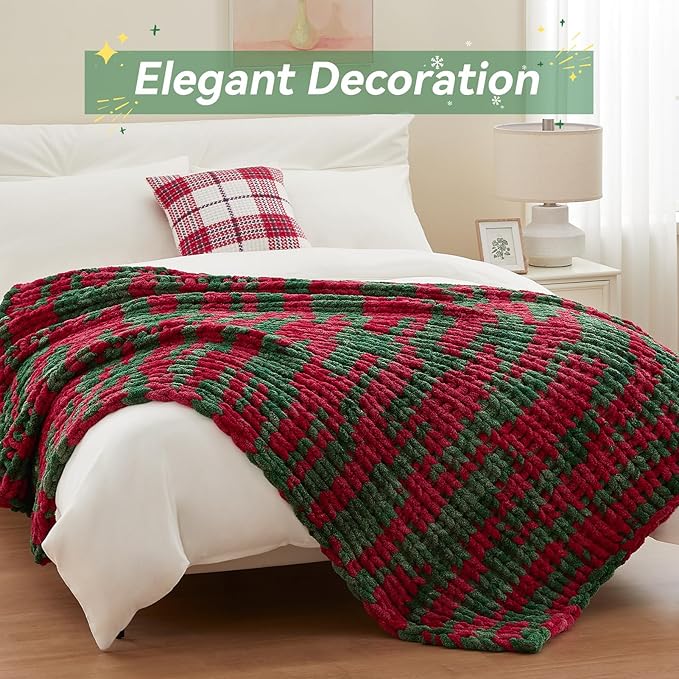 Chunky Knit Throw Blanket, 60''*80'' Knitted Throw Chenille Yarn for Bed Couch, Handmade Stripe Crochet Big Thick Blanket, Machine Washable Cute Comfy Blanket for Home Decor