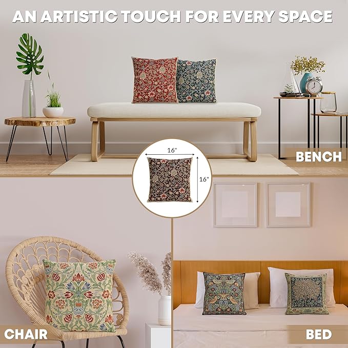 - Diverse Applications: Our couch pillow covers are inspired by the paintings of William Morris and are perfect for spaces including bedrooms, living rooms, and balconies. Create a charming aesthetic with our William Morris pillow covers, which adorn furniture such as a couch, chair, sofa, and window seat. Our pillows for couch blend with styles like boho, rustic, modern, and vintage. Surprise your loved ones on birthdays, weddings, or housewarming events by gifting them vibrant cushion covers