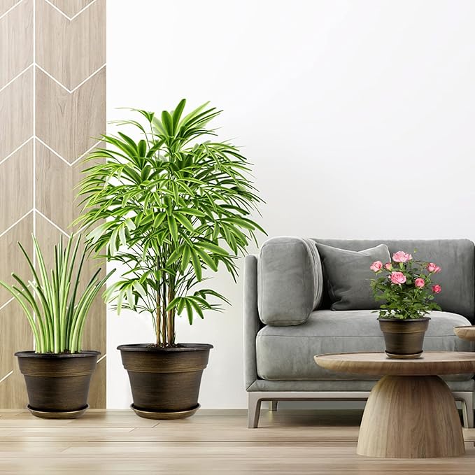 - 【TRADITIONAL DESIGN】Plastic planters for indoor plants with trays are designed in dark gold colors & a classic round look, which allow this pot to fit into any indoor & outdoor setting. With these golded flower pots, it could adds fresh, decorative flair to your home. Decorate your windowsill, desktop, shelf, bedroom, living room, kitchen, garden, office with our 8 inch plastic plant pot.