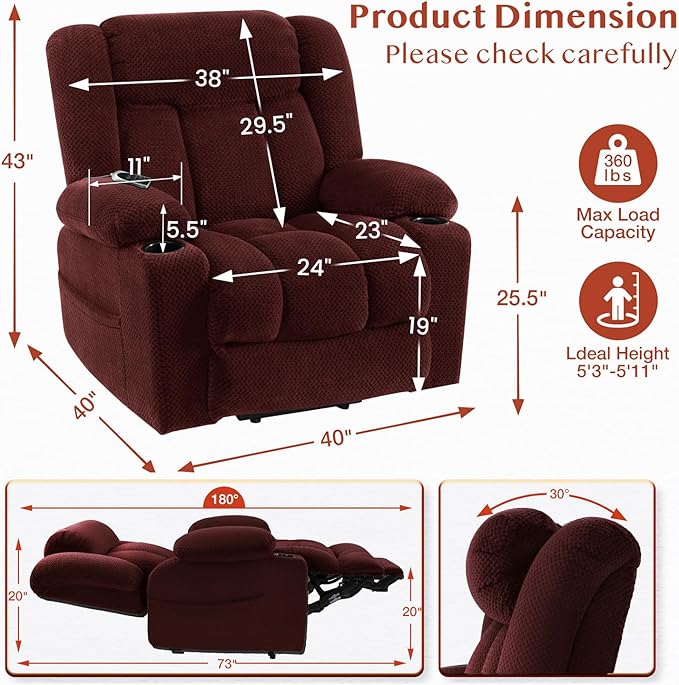 - Large Size for Big & Tall: Our power recliner chair suitable for big and tall 5'4”-6'1”, extended footrests to fully support your feet, prevent from dangling. The cushion 23"x24", providing ample space and comfort