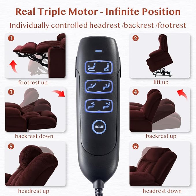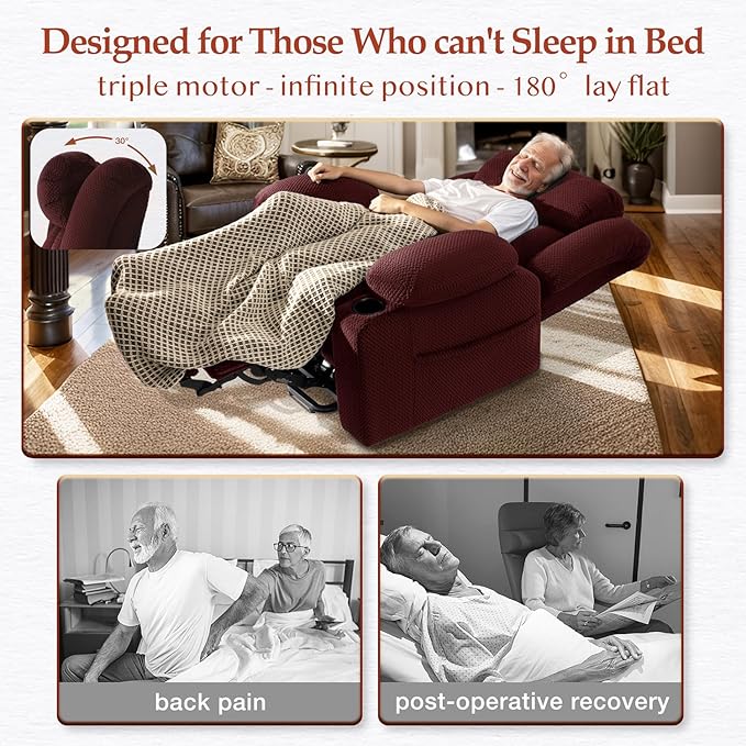 - Real Triple Motor & Infinite Position & 180° Lay Flat: Enjoy power lift recliner chair for elderly, individually controlled headrest /backrest /footrest separately, infinite adjusts 45° to 180° lay flat, designed for those who can't sleep in bed . Whether you're reading, watching TV, napping, sleeping, or standing up, this recliner lift chair meets all your needs