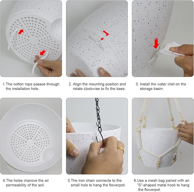 - 【Self-Watering Hanging Planter with Removable Tray】This hanging flower pot comes with a detachable bottom tray that acts as a water reservoir, holding a good amount of water. When your plant needs water, it’s absorbed through cotton wicks from the reservoir to the soil, reducing how often you need to water
