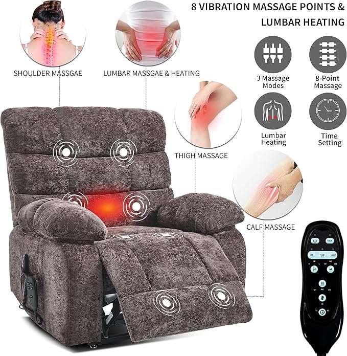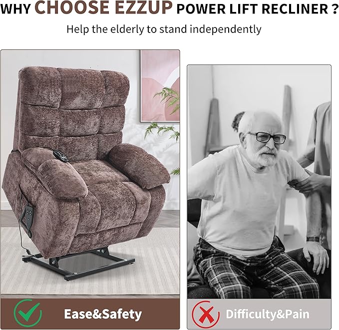 - Vibration Massage & Lumbar Heating: EZZUP's dual motor lift chair has 8 vibration nodes on the back, waist, thighs, and legs. There are 3 massage modes and 3 intensities to meet your different needs. The 15/30/60 minute timer function allows you to easily set massage and heating times. Vibration massage can relax your tired body and promote blood circulation throughout the body!