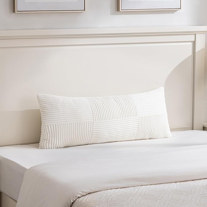Fancy Homi Set of 2 Cream White Boho Long Lumbar Body Decorative Throw Pillow Cover 14x36 Inch for Bed Couch Bedroom Bench, Soft Patchwork Corduroy Textured Pillow Case, Rustic Farmhouse Room Décor