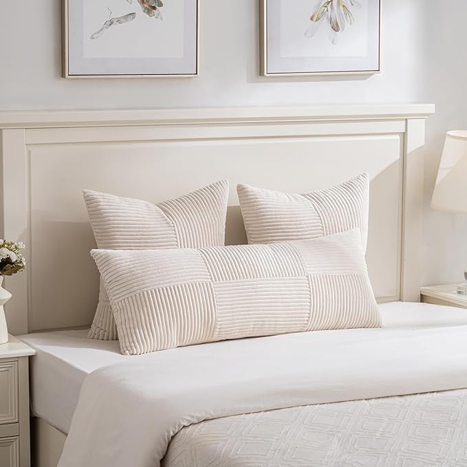 Fancy Homi Set of 2 Cream Boho Long Lumbar Body Decorative Throw Pillow Cover 14x36 Inch for Bed Couch Bedroom Bench, Soft Patchwork Corduroy Textured Pillow Case, Rustic Farmhouse Room Décor