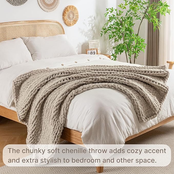 Chunky Knit Blanket Throw, 100% Hand Knit Throw Blanket Handmade Chenille Cable Knit Throw for Couch, Stylish Cozy Soft Rope Knot Crochet Blanket for Home Decor, Beige Linen, 40x50 Inches