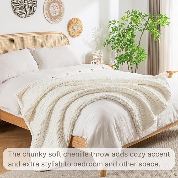 Chunky Knit Blanket Throw, 100% Hand Knit Throw Blanket Handmade Chenille Cable Knit Throw for Couch, Stylish Cozy Soft Rope Knot Crochet Blanket for Home Decor, Ivory, 40x50 Inches