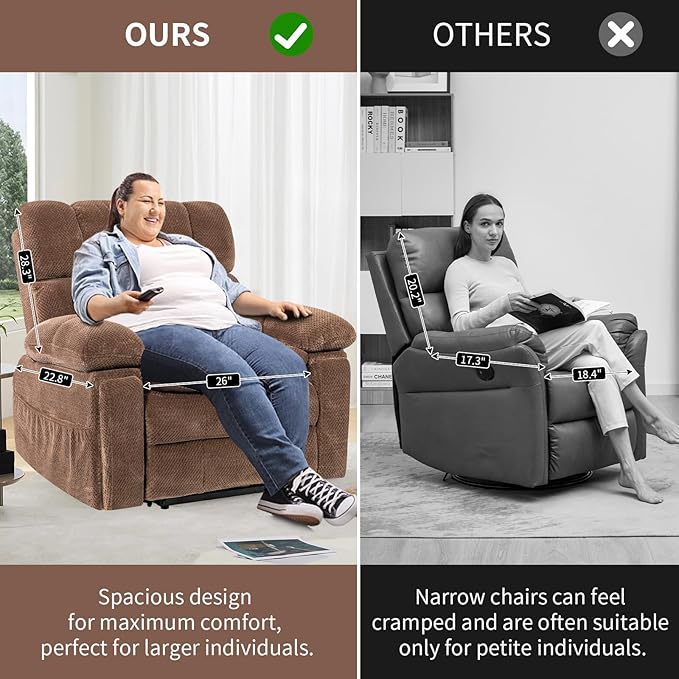 - Oversize Recliner: Featuring a spacious 26" wide seat and 35" wide backrest, this recliner is specially designed for big and tall individuals. Ideal for users between 5'5"–6'1" and supporting up to 350 lbs, it offers superior comfort and support. The thickened front cushion stays firm even after long hours of sitting, providing enhanced thigh comfort without sagging