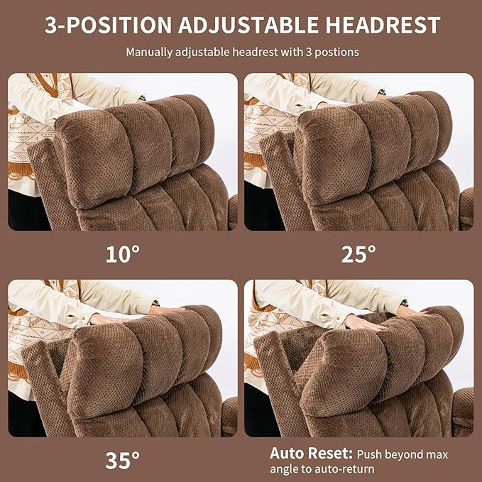 - Manual Headrest adjustment: Electric recliner chairs with adjustable headrests, There are three adjustable levels in total:10°,25°,35°. You can adjust different angles according to your application scenarios. allowing you to watch TV or lean back without straining your neck or head, for personalized comfort