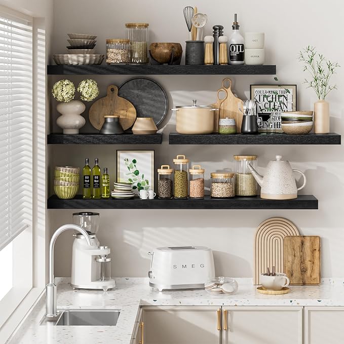 - Perfect Wall Decor: Handcrafted from premium 1.5" thick wood, our wood floating shelves boast a unique wood grain that infuses your space with timeless charm. Perfectly suited for any modern, traditional, rustic, or farmhouse decor, this shelf elevates the ambiance of your home and kitchen. With 4 colors and 4 sizes, you can creatively arrange your storage space with your style.