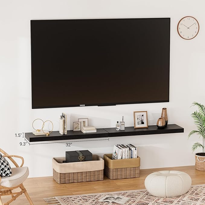 - 【Longer Design】Our pretty 32 inch black wall shelves are 32"W x 9.3"D x 1.5"H.Our 32 floating shelves is longer than traditional designs and can hold more items.The black floating shelf optimize wall space,helping organize essentials without taking up floor space in your home.