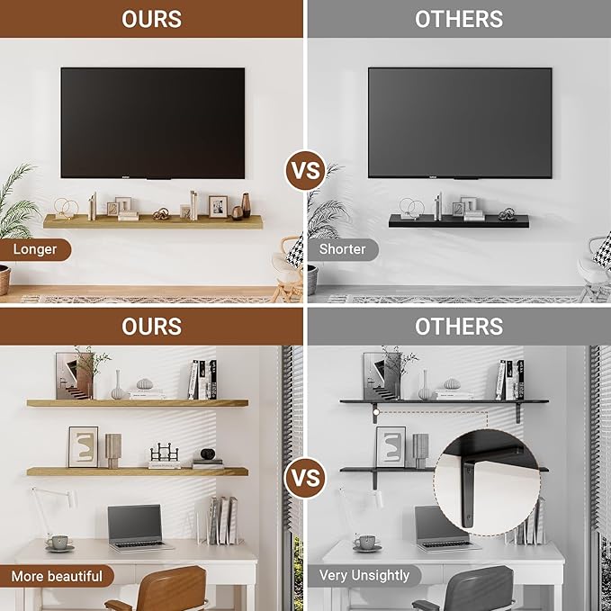 - 【Longer Design】Our pretty white oak floating shelves are 48"W x 9.3"D x 1.5"H.Our wall shelf is longer than traditional designs and can hold more items.The floating shelves oak optimize wall space,helping organize essentials without taking up floor space in your home.