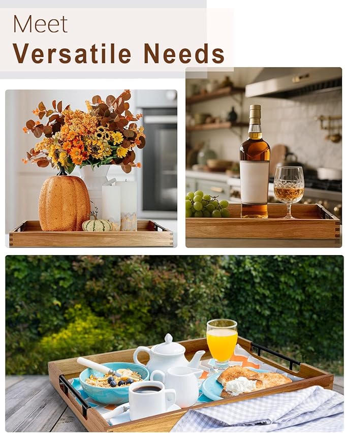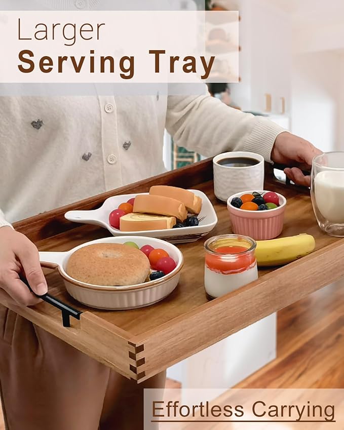 - PREMIUM ACACIA WOOD β Crafted from high-quality natural wood, this wooden tray is sturdy and durable. The unique dovetail joinery ensures long-lasting use, while the clear paint finish makes maintenance effortless.