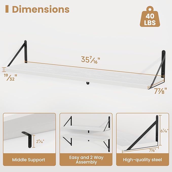 - 【Sturdy and Durable】The wall-mounted shelves are sturdy enough,with a load-bearing metal frame added in the middle,which will not deform and can withstand a weight of 40 pounds. It is very suitable for use as a wide bookshelf,TV stand,for home office,laundry room. Follow the instruction steps,including all necessary hardware,easy to assemble.