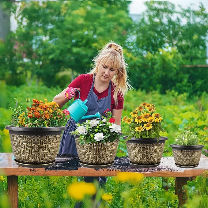 - 【Includes 4 Flower Pots+ Saucers】Enjoy an amazing value of 4 Retro antique imitation plant pots that include unique drainage holes and saucer trays. These plant pots outdoor are available in small medium and large size which is ideal for flowers, orchids, herbs, cactus, peace lily, snake plant, succulents, and a variety of other plants in the house and workplace, as well as on the patio and porch!