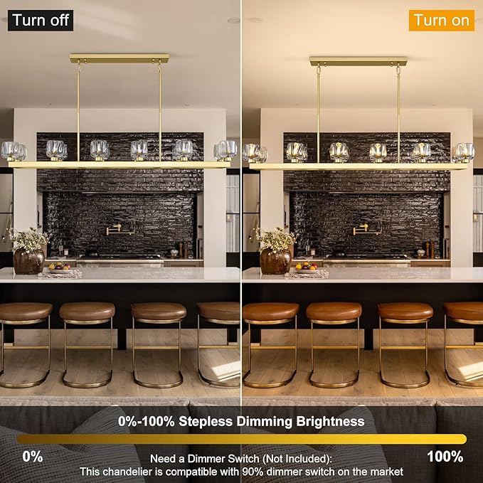 - 【12-Light Chandelier】Gold rectangle chandelier offers 360° light coverage to brighten your space & create a cozy vibe. The linear chandelier for dining room requires 12 G9 bulbs and available for infinite dimming via a dimmer. (Dimmable bulbs & dimmer not included).