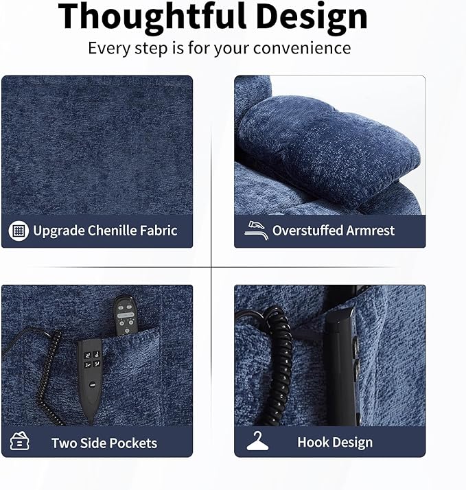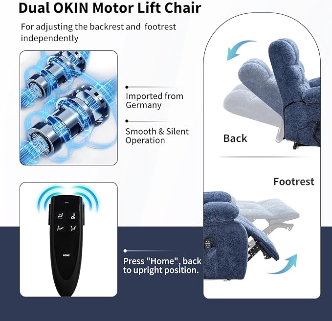 - Vibration Massage & Lumbar Heating: EZZUP's dual motor lift chair has 8 vibration nodes on the back, waist, thighs, and legs. There are 3 massage modes and 3 intensities to meet your different needs. The 15/30/60 minute timer function allows you to easily set massage and heating times. Vibration massage can relax your tired body and promote blood circulation throughout the body!