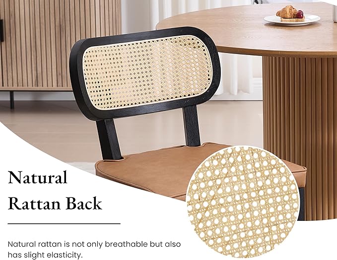 EALSON Mid Century Modern Rattan Dining Chairs Set of 2 Farmhouse Black Wood Kitchen Chairs with Cane Back Leather Upholstered Accent Armless Chairs for Dining/Living Room Restaurant, Brown