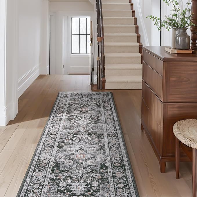 AMOAMI-2X6 Runner Rug-Washable Runners for Hallways-Soft Non Slip Bedside Rugs for Bedroom-Vintage Long Rug for Hallways Entryway Laundry Room Stair Kitchen Bathroom Dark Grey & Black