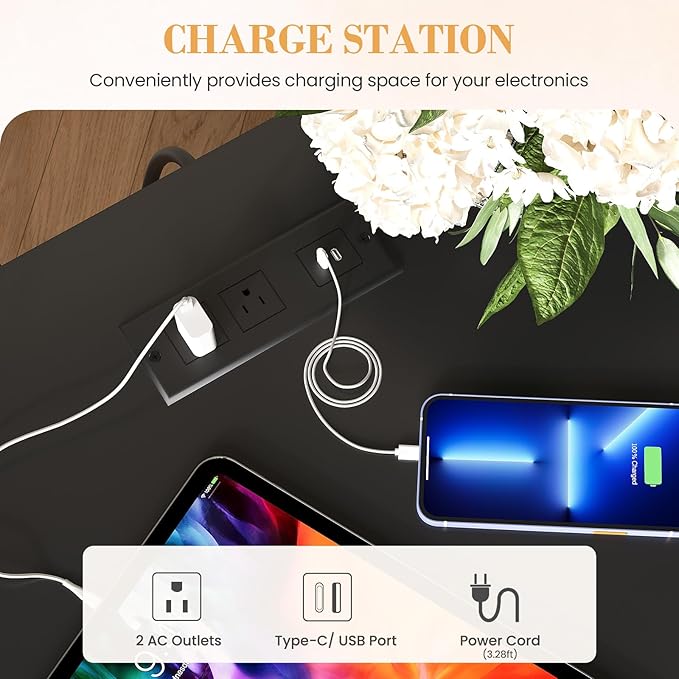 - Built-In Charging Station for Convenience: Stay powered up with the integrated charging hub: 2 AC outlets and 2 USB ports of side tables bedroom let you charge phones, tablets, lamps, and more simultaneously. Keep cables of nightstand with charging station tidy and devices of farmhouse coffee table within reach—no more scrambling for adapters or sacrificing bedside space to clutter