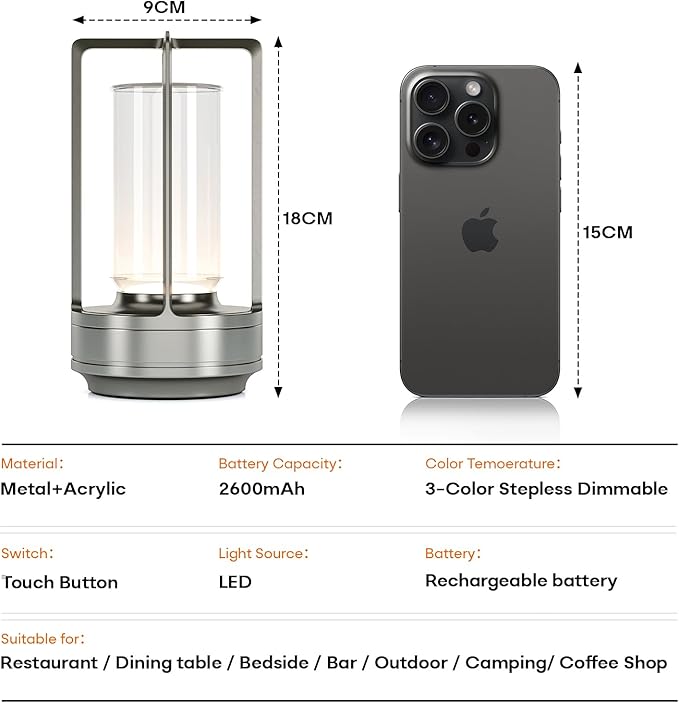 - π [ A perfect gift idea ]: Our touch light lamp can match a variety of scenes and styles while making a great gift. It can be used as an ambient light for Thanksgiving, Christmas and birthday parties. The rechargeable cordless led table lamp is suitable for bedroom, bedside table, office, restaurant, cafe, bar, hotel, outdoor patio lighting, etc.