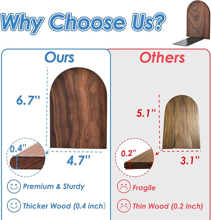 - Natural Black Walnut Craftsmanship: Crafted from black walnut with unique natural grain patternsβno veneers or synthetic dyes, each pair is unique. Thicker wooden bookends are more durable and resistant to drops, adding the breath of nature for your desk.