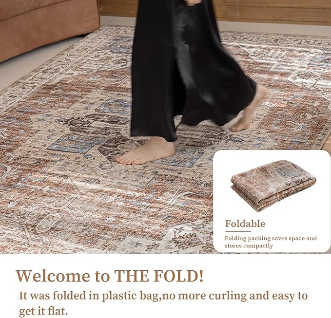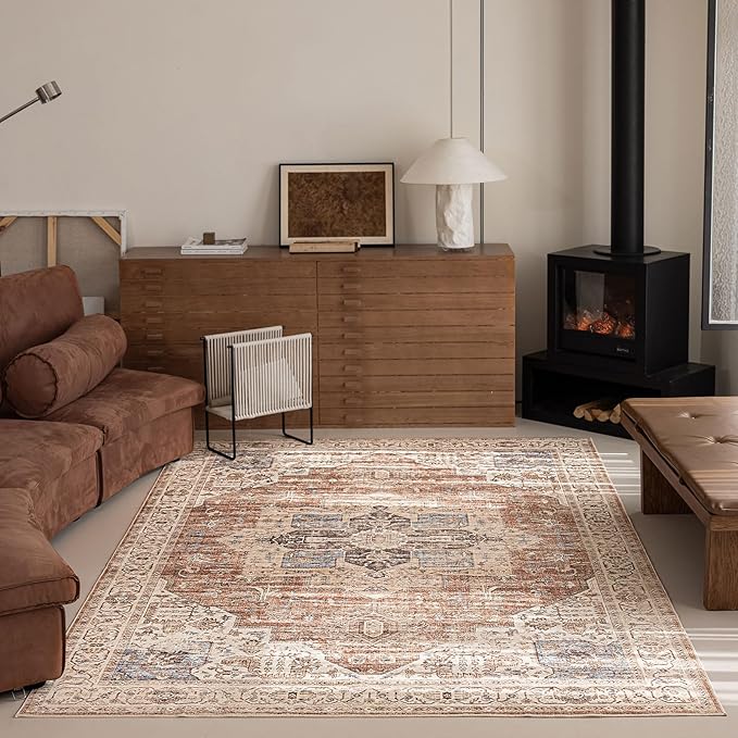 5'x7' Area Rug - Vintage Persian Medallion Design Low-Pile Faux Wool Rug, Non-Slip Backing, Machine Washable, for Living Room, Dining Room, Bedroom (Brick Red)