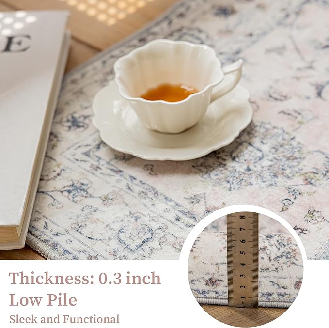 3'x5' Vintage Floral Rug - Persian Inspired Low-Pile Faux Wool Area Rug, Non-Slip Washable Small Rug for Bedroom, Nursery, Dorm, Soft Pink Boho Chic Decor