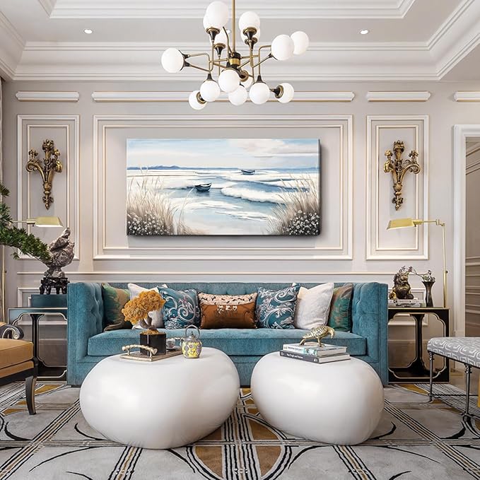 - Modern Coastal Aesthetic – Designed with soft neutral tones of blue, beige, and cream, this large artwork brings a calming and sophisticated coastal vibe to any modern or transitional space.