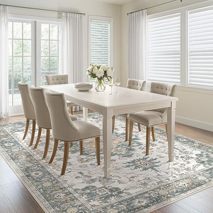 Washable Area Rugs for Living Room -10x12 Neutral Vintage Distressed Floral Farmhouse Boho Large Soft Floor Rug Indoor Non Slip Carpet for Living Room Bedroom Dining Room Office -Green/Grey