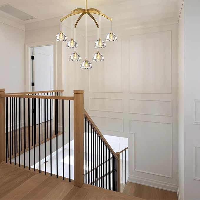 - Sleek Round Modern Design: The circular Golden frame and seven transparent glass shades create a minimalist yet bold statement. Ideal as a modern chandelier or round chandelier, its clean lines add architectural sophistication to any space.