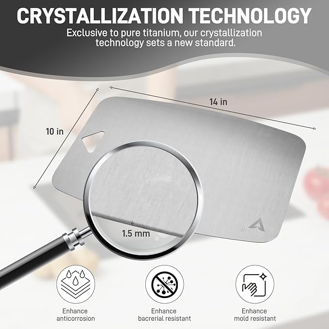 - DURABLE TITANIUM METAL: Crafted from 100% pure titanium, our chopping board will not warp, crack, or chip with heavy use in the kitchen, unlike plastic or wood cutting boards. The non-porous titanium metal also prevents staining.