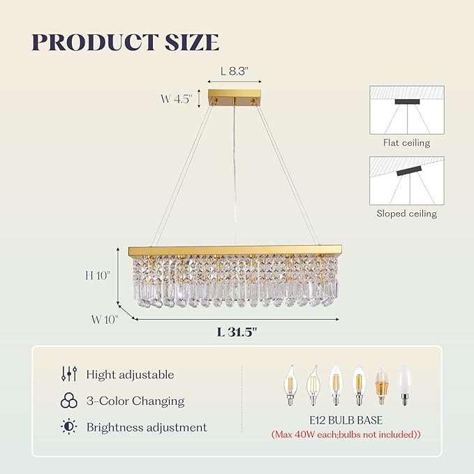 - 💡 【3-Color Lighting with Dimmable Option】Customize your ambiance with 3-color light options (2700K/4500K/6000K)—warm, neutral, or cool white. This modern crystal chandelier supports full dimming when used with dimmable E12 bulbs and a compatible dimmer switch (bulbs and switch not included). Create the right mood for every moment.
