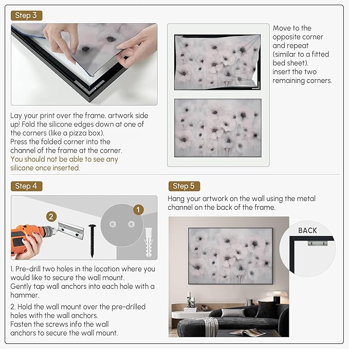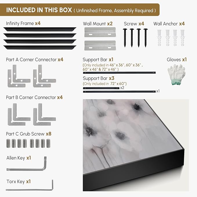 - Assembly Required: The artwork comes with the frame components unassembled. Don’t worry — setup is straightforward and tool-friendly. For best results and accurate alignment, we recommend two people to ensure a smooth assembly and a stable, secure wall mount.