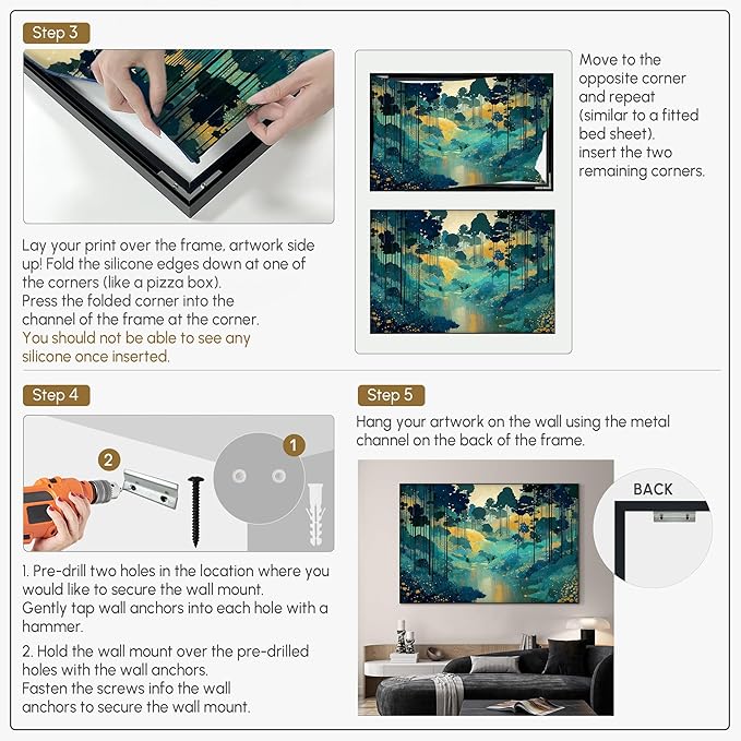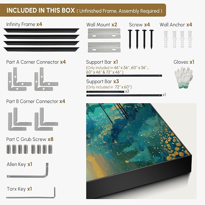 - Assembly Required: The artwork comes with the frame components unassembled. Don’t worry — setup is straightforward and tool-friendly. For best results and accurate alignment, we recommend two people to ensure a smooth assembly and a stable, secure wall mount.