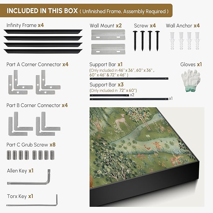 - Assembly Required: The artwork comes with the frame components unassembled. Don’t worry — setup is straightforward and tool-friendly. For best results and accurate alignment, we recommend two people to ensure a smooth assembly and a stable, secure wall mount.