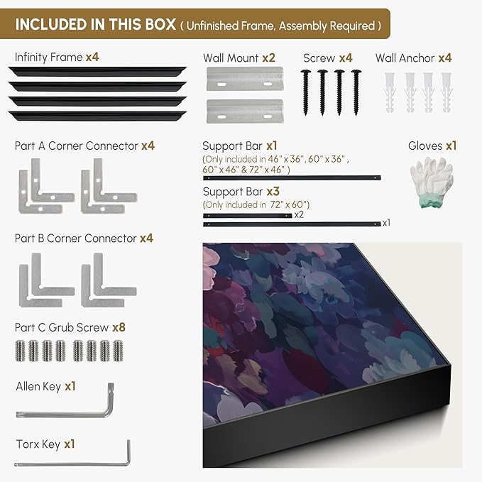- Assembly Required: The artwork comes with the frame components unassembled. Don’t worry — setup is straightforward and tool-friendly. For best results and accurate alignment, we recommend two people to ensure a smooth assembly and a stable, secure wall mount.