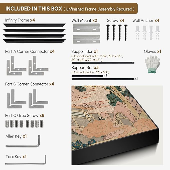 - Assembly Required: The artwork comes with the frame components unassembled. Don¡¯t worry ¡ª setup is straightforward and tool-friendly. For best results and accurate alignment, we recommend two people to ensure a smooth assembly and a stable, secure wall mount.