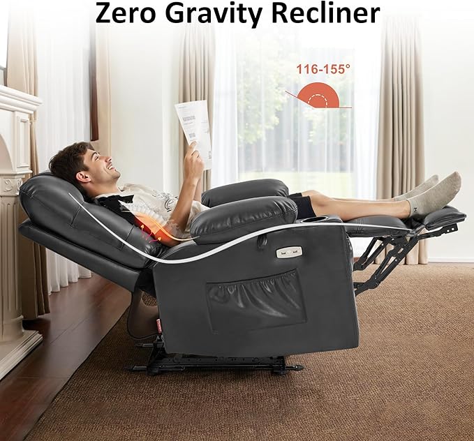 MCombo Zero Gravity Power Recliner Chair with Heat and Vibration Massage, Reclining Chair with USB Ports, Cup Holders for Living Room, Faux Leather PR621 (Grey)