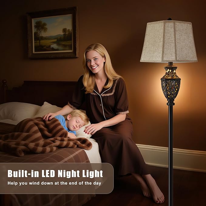 Luvkczc Vintage Black Floor Lamp - Hand-Painted Gold Resin with 6-Sided Carved Hollow Nightlight, Traditional Standing Lamp for Living Room, Bedroom, Study (Bulb Included)