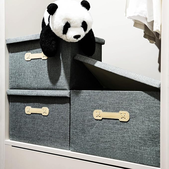 Enzk&Unity Decorative Storage Boxes with Lids, 3 Pack Grey Fabric Storage Bins with Handle, Foldbale and Stackable Storage Boxes for Shelf, Closet, Bedroom, Living Room