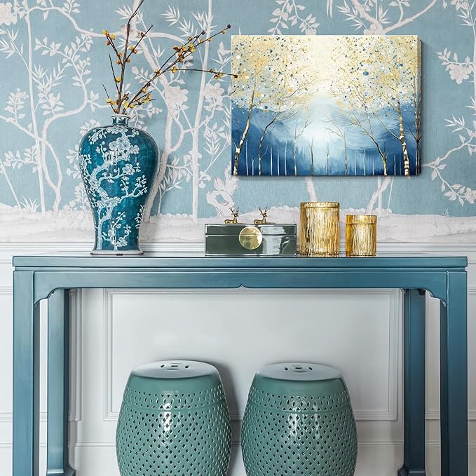 - Modern Abstract Forest Design: This minimalist landscape art captures slender birch trunks reaching toward a luminous sky, showered with soft golden and navy-blue splatters that evoke morning light filtering through the trees. The calming blend of cool and warm hues makes it an effortless accent for any room.