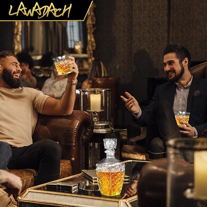- Excellent Whiskey Decanter Set 🥂 If you're looking for a suitable whiskey decanter, then this is what you're looking for. The decanter set comes with a glass liquor decanter and two whiskey glasses, it's time to invite your friends for a toast!