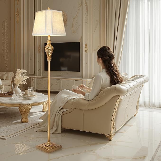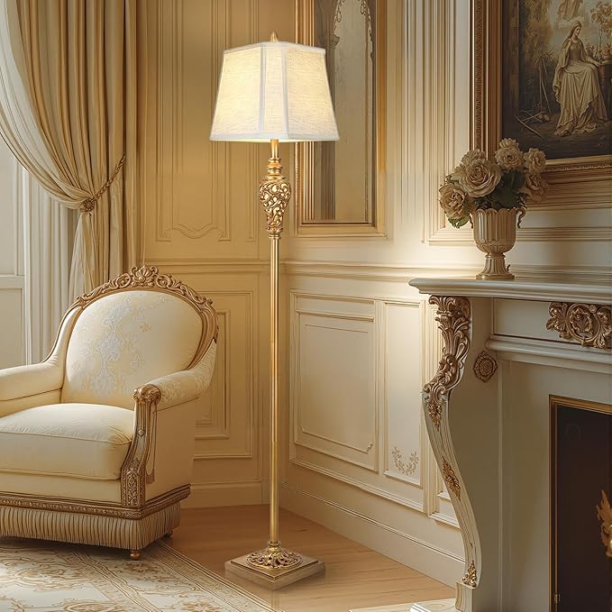- UNIQUE DESIGN: This vintage floor lamp features an exquisite hollow carved night light and base, which makes it look more beautiful and elegant. Made of durable resin and metal with antique gold finish, it adds a retro farmhouse and luxurious feel.