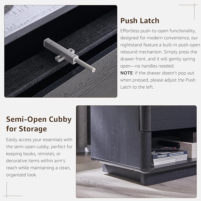 - Handle-Free Design – Clean and modern design,features Push-to-Open drawers for easy and convenient operation.Adjustable push-latch mechanism and smooth glides ensure quiet, handle-free convenience—perfect for maintaining a clean, streamlined space.While the rounded edges ensure safety for kids and families.