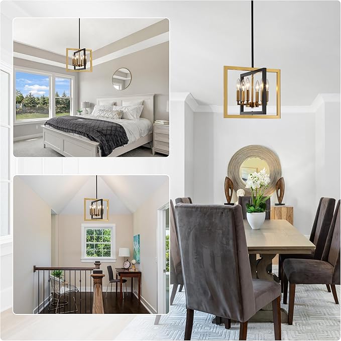 - Modern Geometric Chandelier: This rustic and artistic chandelier features a matte black metal frame complemented by a striking gold frame and 6 elegantly simple lamp arms. Its unique appearance adds a stylish touch, making it ideal for any space such as the kitchen island, bedroom, foyer, dining table, living room, entryway, farmhouse, and office