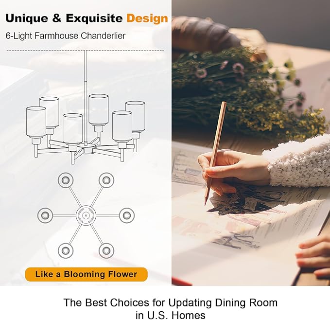 - Modern Chandelier: This dining room light fixture is made of 6 clear glass shades and sturdy metal frame, features a modern and minimalist design to showcase elegance and artistry. Whether in a classic or contemporary home style, it seamlessly blends in and becomes a striking focal point in the space.