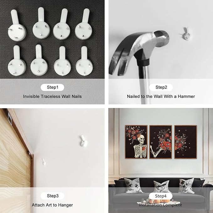 - [Easy To Hang] This dark Gothic skull wall art measures 16x24 inches (40x60 cm) and is very easy to hang.Just first determine where you want to hang it,then secure the nails and hang the frame on the nails.It only takes a few minutes to install successfully
