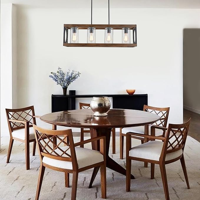XINGQI Rectangle Chandeliers 31.5" Farmhouse Kitchen Island Lighting Fixture Over Table Modern Vintage Linear Hanging 4-Light for Dining Room Living Room Black Wood Grain Finish with Glass Lampshade