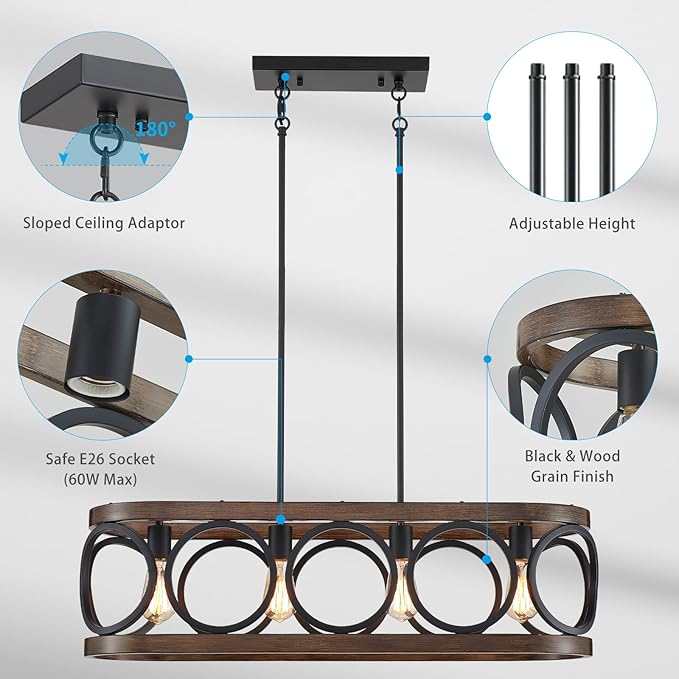 - Vintage Elegance: Transform your dining area or kitchen island with this open-cage chandelier, featuring a distinctive rectangle frame in a black wood grain finish. This design brings a rustic charm that beautifully complements traditional decor, enhancing the overall atmosphere in your home